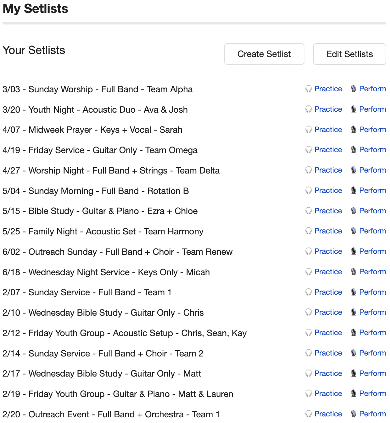 From here, you can click into any setlist to edit the songs inside, or use the Practice/Perform buttons to get started.