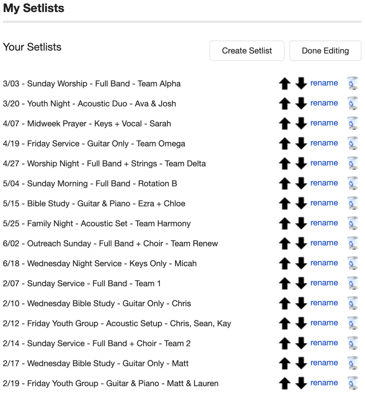 - Options to ➕ add, ✏️ rename, ⬆️⬇️ reorder, or 🗑️ delete your setlists (when you click 'Edit Setlists')