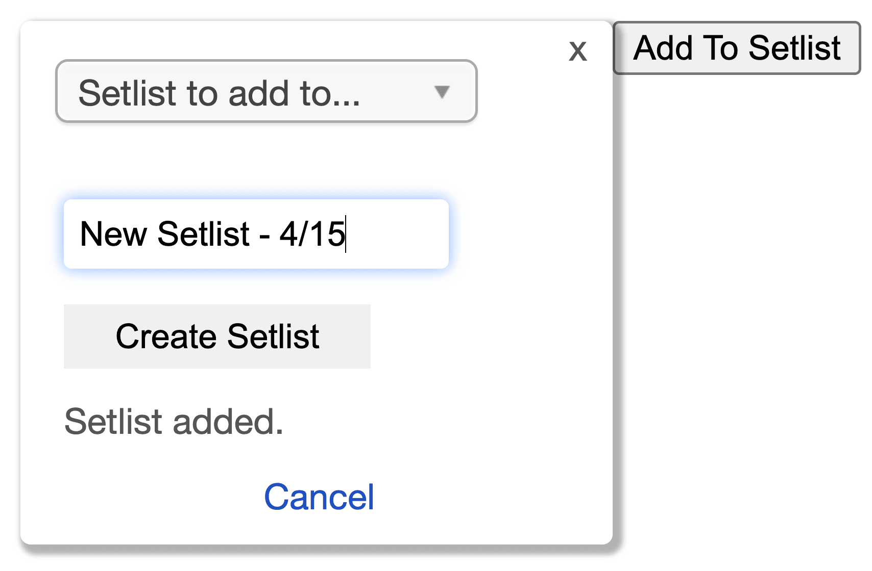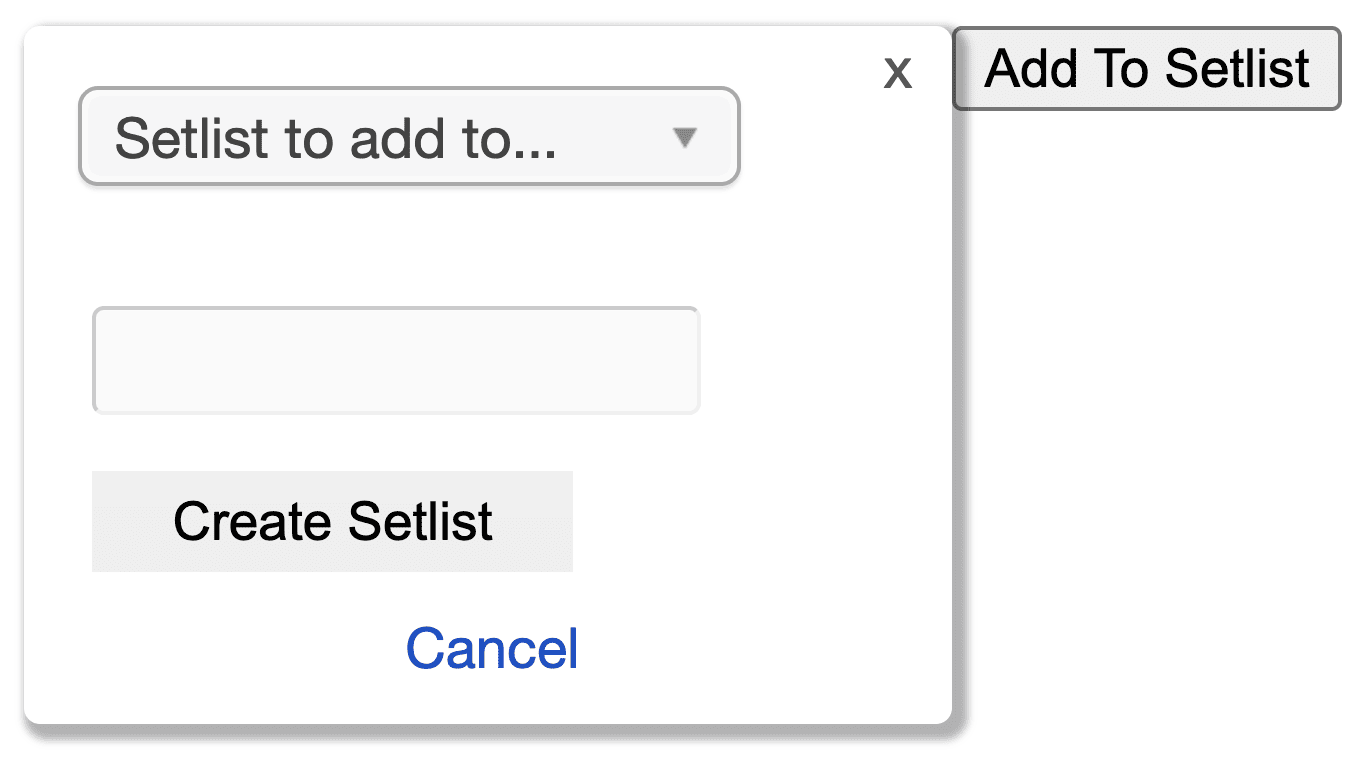 A dropdown will appear titled “Setlist to Add To”.