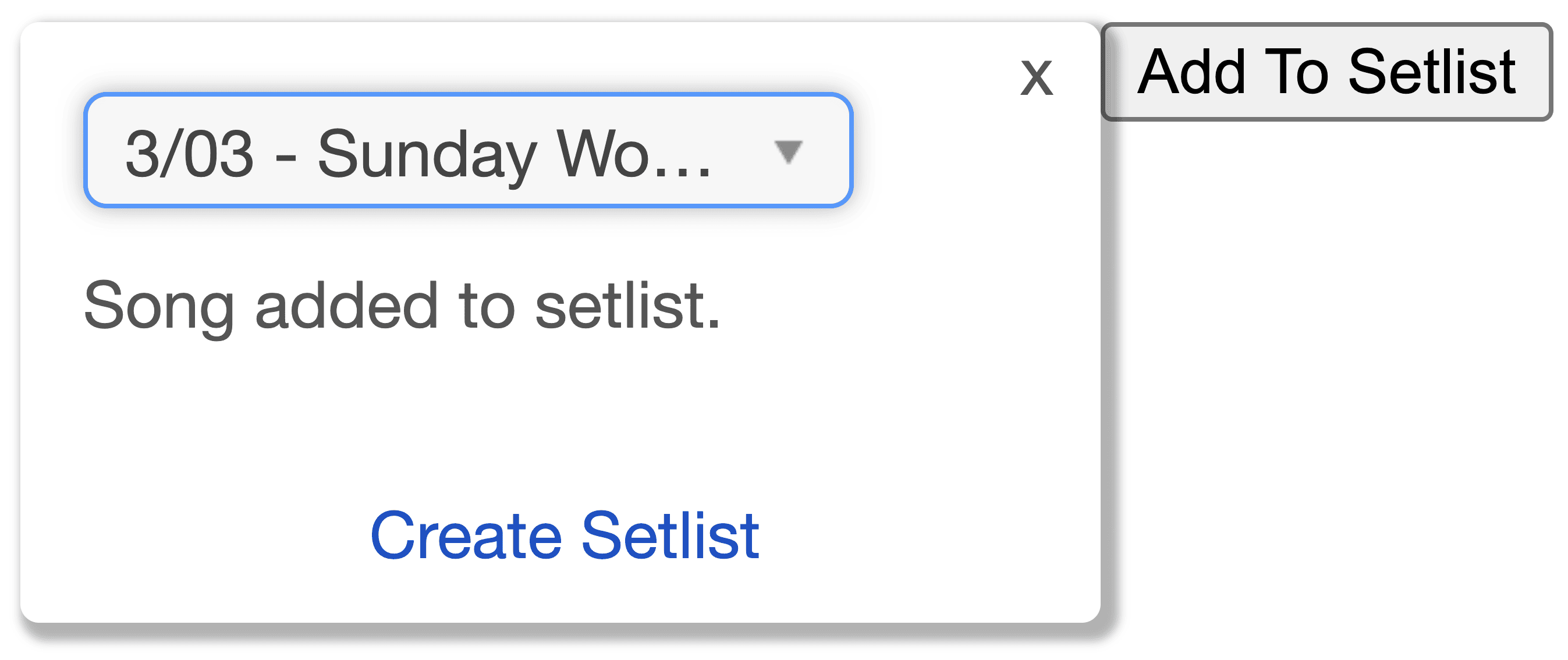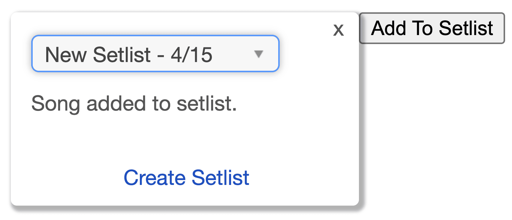 Once the new setlist is created, you can select it in the dropdown. The current song will be added to it.